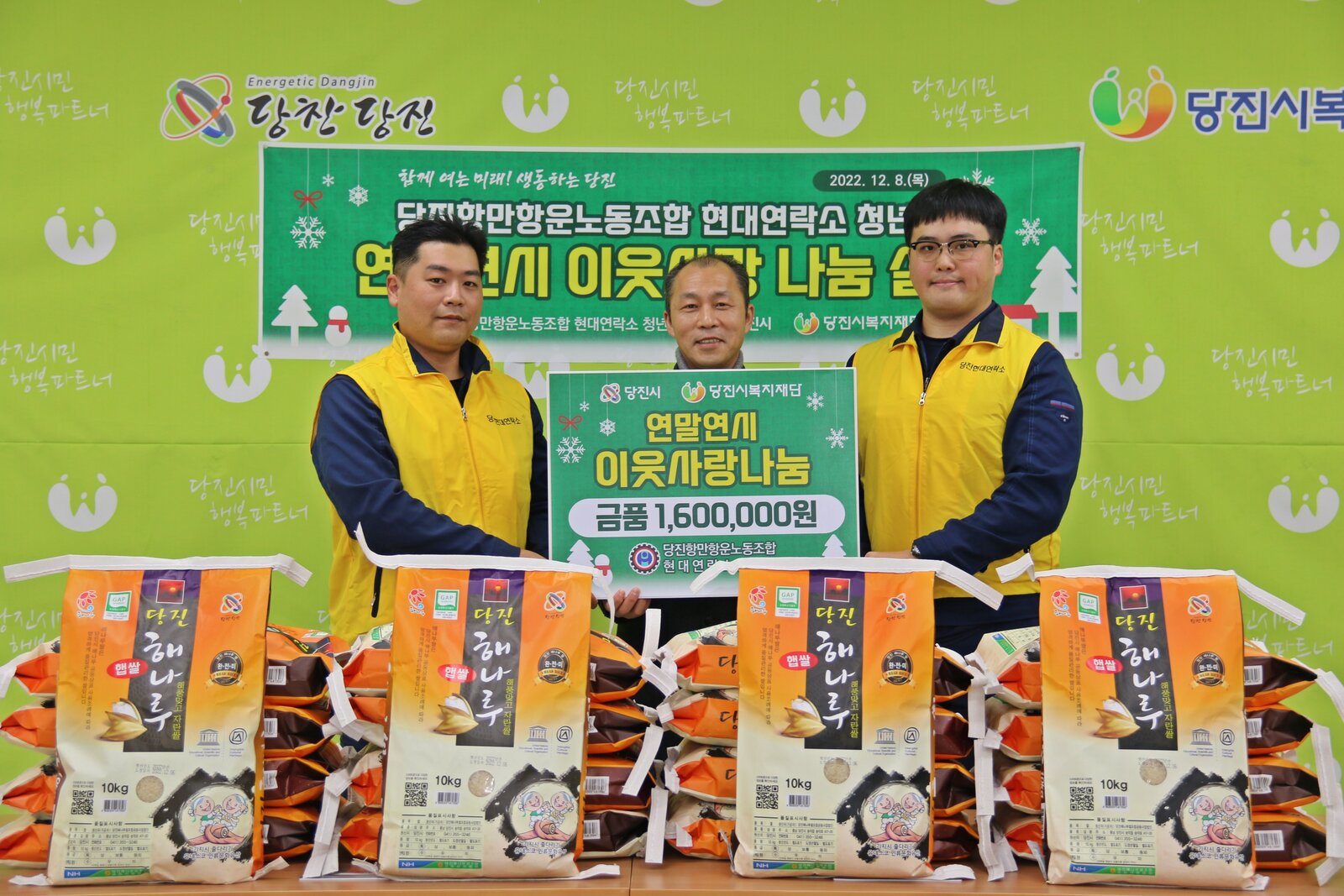 당진항만항운노동조합 현대연락소 청년회(회장 김원용)가 지난 12월 8일 당진시 출연 기관인 당진시복지재단을 방문해 우리 지역에 거주하는 사회적약자(독거노인·아동·청소년) 가정에 전달해 달라며 후원금 1백만 원과 60만 원 상당의 백미 20포(10kg)를 전달하며 연말연시 이웃사랑 나눔 활동을 실천했다.