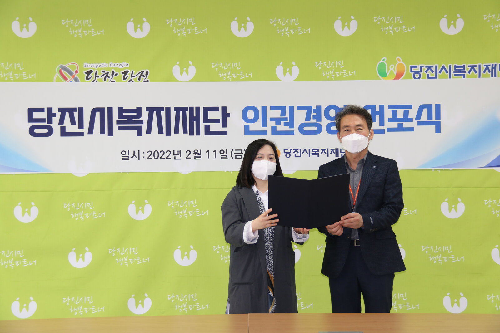 당진시복지재단 ‘인권경영 운영세칙’에 근거하여 이사장님을 모시고 인권경영 선포식을 진행하였습니다.