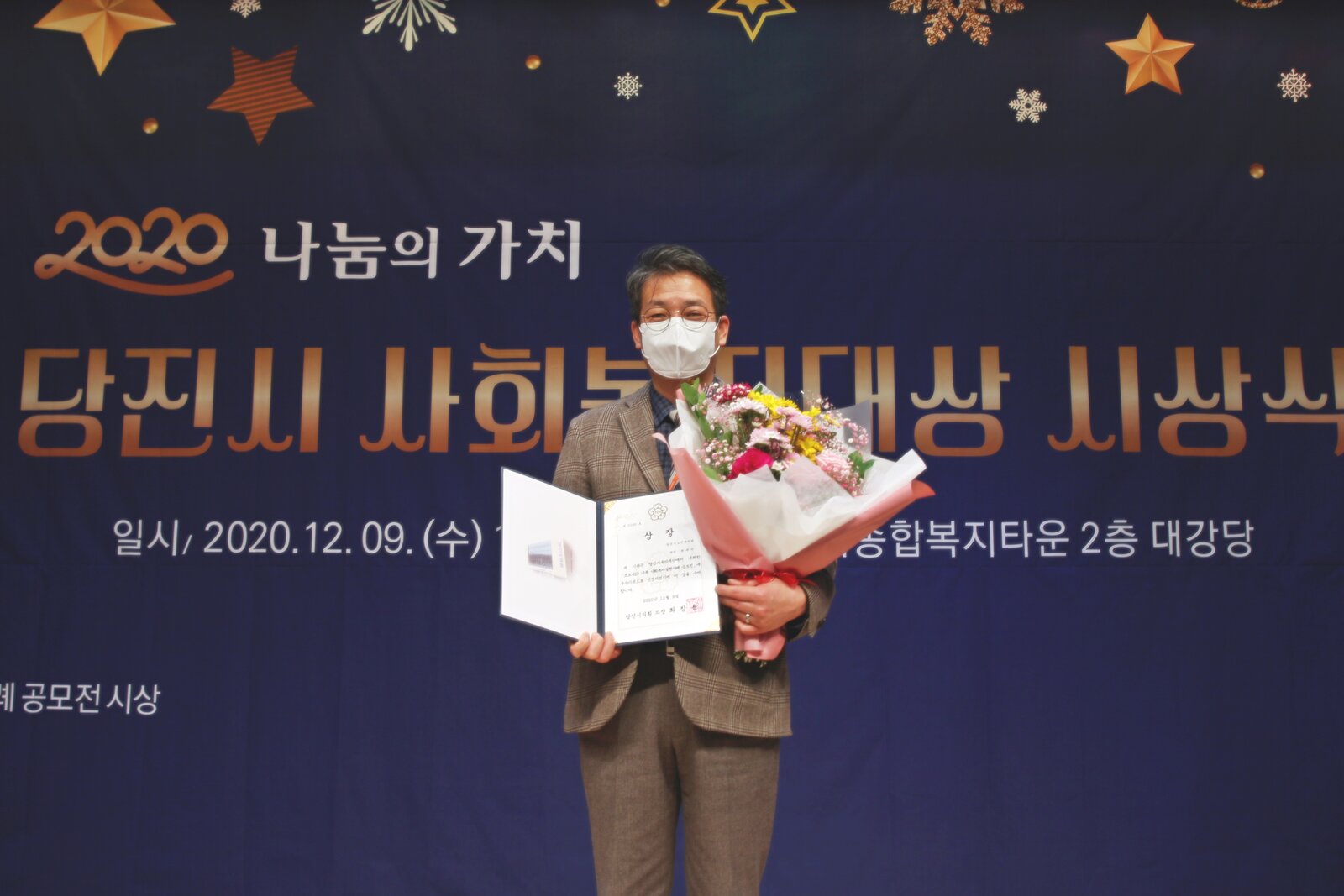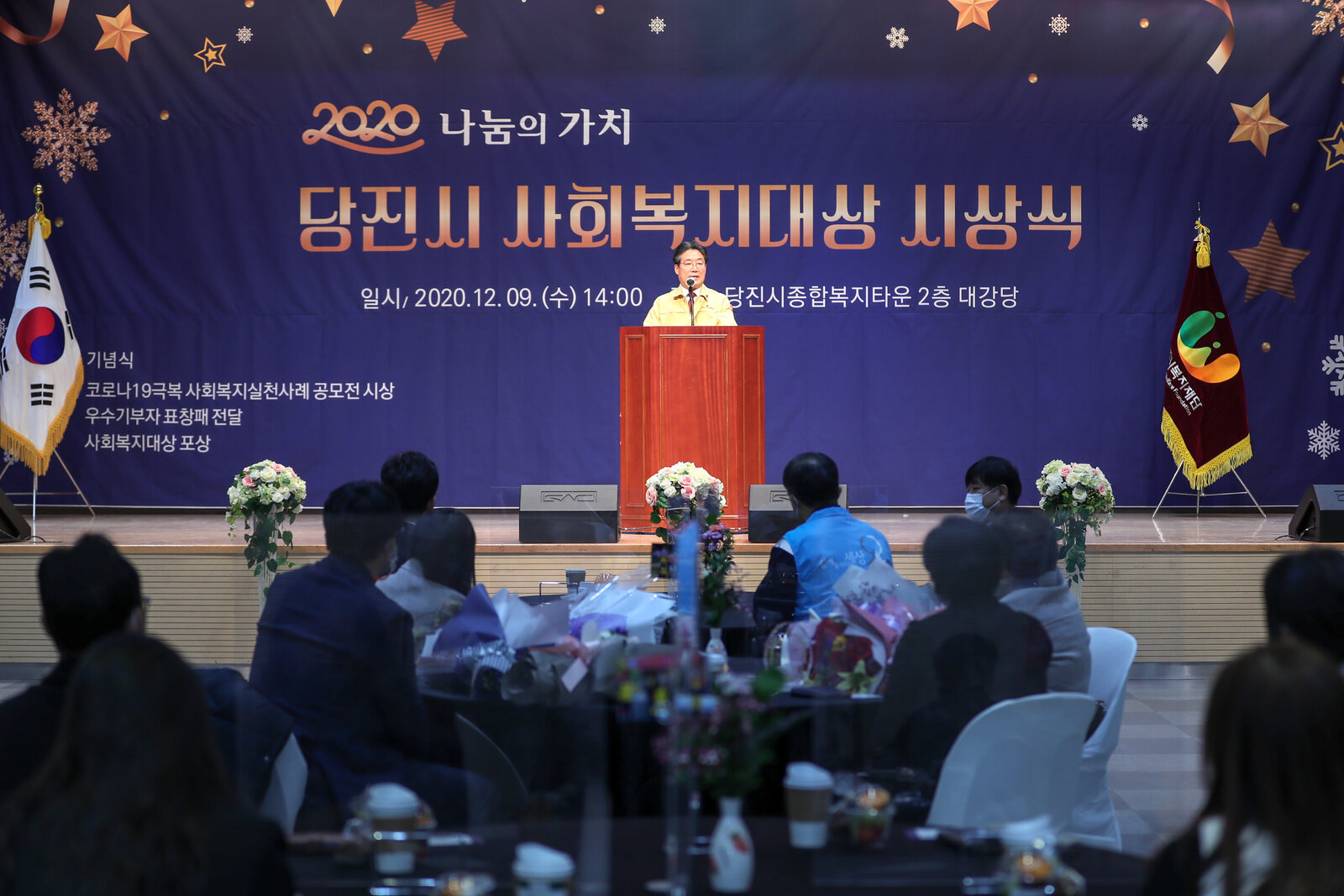 금번 사회복지대상에는 "당진시남부노인복지관 김건식 과장"이 선정되었으며, 최우수에는 "당진재가장기요양센터 김영죽 요양보호사"와 "당진시장애인복지관 김정선 팀장", "당진시건강가정지원센터 이영근 팀장"이 선정되었습니다. 또한, 코로나19 극복 사회복지실천사례 공모전에 입상한 기관에 대한 시상과 우수기부자를 표창하는 시간을 함께 가졌습니다.
