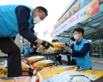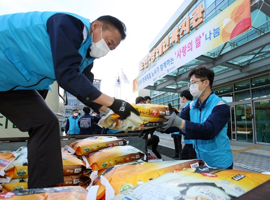 현대제철 당진제철소 노사가 급여 끝전 2200만 원을 모아 마련한 백미 10kg 630포를 28일 당진시종합복지타운 일원에서 우리 재단에 기탁했다.