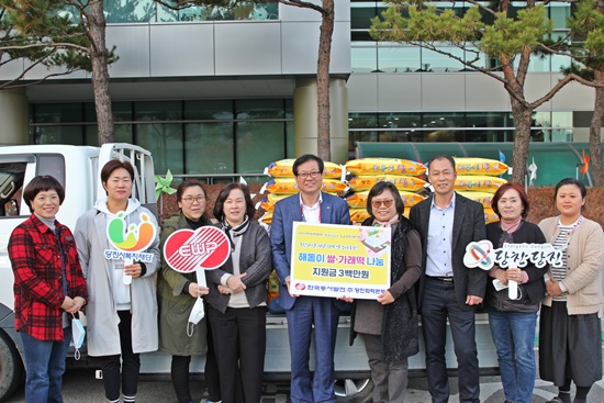 당진시 출연 기관은 우리 재단을 방문해 300만원 상당의 지역 쌀 소비 촉진에 일환으로 해돋이 쌀과 가래 떡을 기탁했다.