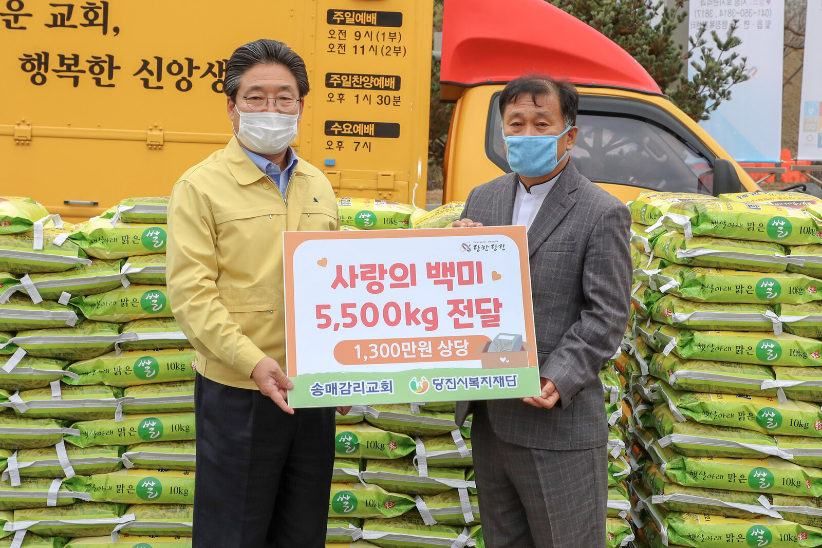 지난 20일 당진 송매감리교회(김종필 담임목사)가 당진시복지재단(이사장 왕현정, 이하 '재단')에 백미 550포를 기탁했습니다.