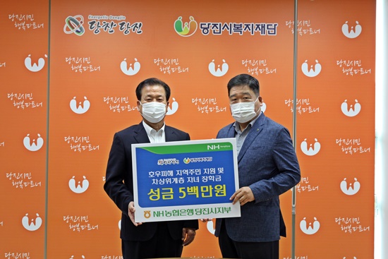 NH농협은행 당진시지부(지부장 차종현, 이하‘당진시지부’)가 추석 명절을 며칠 앞둔 14일, 시(市) 출연 기관인 당진시복지재단(이사장 왕현정)을 방문해 호우피해를 입은 지역민과 저소득 취약계층을 지원하는 데 사용해 달라며 500만 원을 기탁 했다.