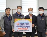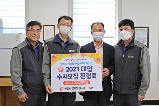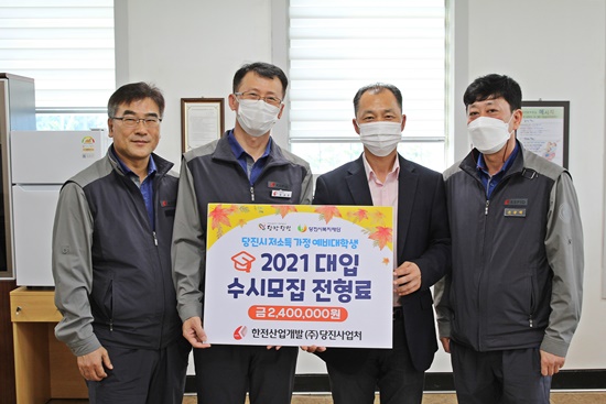 당진시 석문면에 소재한 한전산업개발(주)당진사업처(처장 동호준, 이하‘한전산업’)가 2021년 대입 수시모집 원서접수를 며칠 앞둔 10일 사업처 회의실에서 시(市) 출연 복지재단에 저소득 취약가정 수험생들의 수시모집 전형료(원서접수 비용)로 사용해 달라며 후원금 240만 원을 기탁 했다.