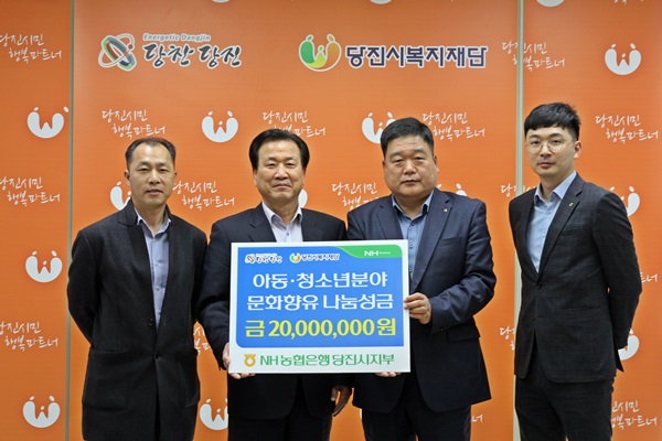 NH농협은행 당진시지부(지부장 차종현, 이하‘당진시지부’)가 6일 시출연기관인 당진시복지재단(이사장 왕현정, 이하‘복지재단’)을 방문해 우리 지역 내 아동・청소년들의 문화 활동 증진을 위해 사용해 달라며 2천만원을 기탁했다.