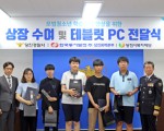 교육용(학습용) 테블릿 PC와 상장을 전달하며, 청소년들의 꿈을 응원하고 있다.