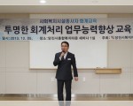 이날 교육은 각 기관의 회계담당자들을 대상으로 한 보수교육으로 강의진행은 본 재단 감사인 배상열 공인회계사가 진행하였다. 교육은 사회복지시설회계의 기본적 이해, 회계, 예산과 결산등의 내용을 사회복지법인,시설 재무회계규칙을 중심으로 이루어졌다. 또한 사대보험과 세무업무, 연말결산 등의 내용에 참가자의 관심이 나타나 이 부분의 자세한 설명이 곁들여졌다.