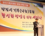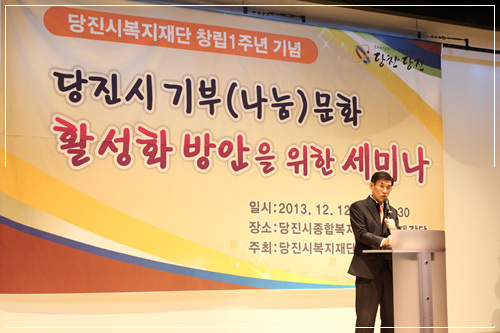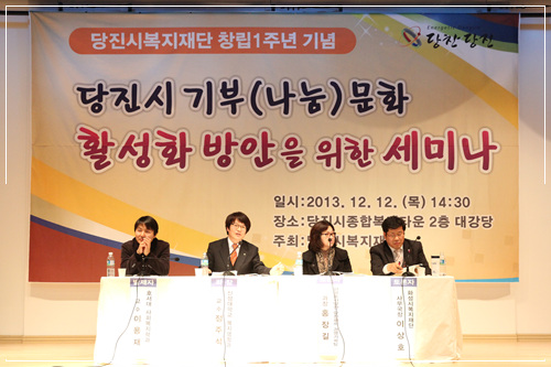 당진시복지재단(이사장)은 지난 12일 당진시종합복지타운(2층 대강당)에서 관내 사회복지 종사자, 관련 전문가, 기업체, 사회단체, 시민들이 한 자리에 모인 가운데 지역실정에 알맞은 기부문화 방안을 강구하고 논의하기 위한 목적으로 “당진시 기부(나눔)문화 활성화 방안” 을 주제로 창립 1주년 기념 세미나를 개최 하였다.