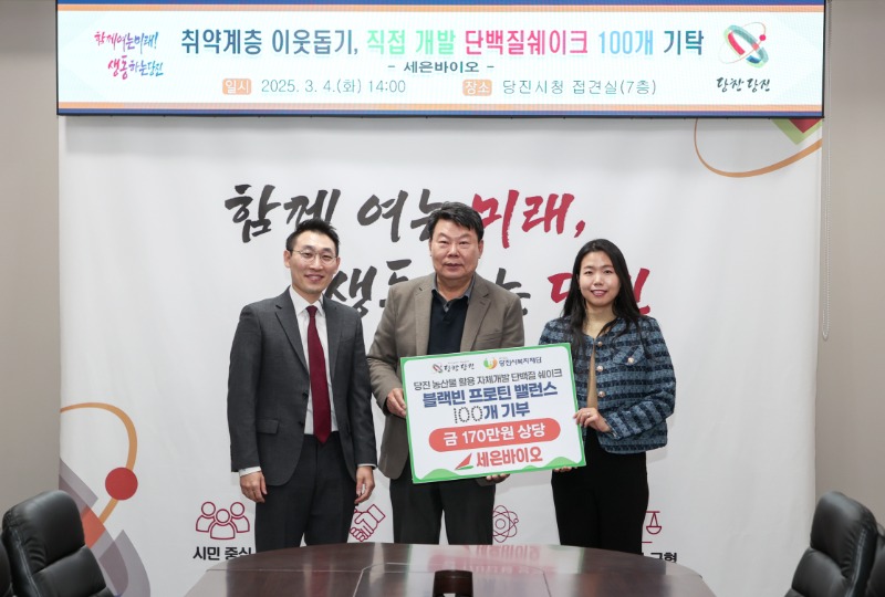 세은바이오 직접 개발 단백질쉐이크 100개 기탁 페이지 정보 작성자 당진시복지재단 작성일25-04-04 15:39 조회수67 본문 3월 4일 세은바이오에서 당진시청을 방문해 당진 농산물 활용 자체개발 단백질 쉐이크인 블랙빈 프로틴 밸런스 100개를 기탁했습니다. 목록 이전글 당진발전본부 저소득 보호아동을 위한 신학기 학용품 지원 25.04.04 다음글 당진우리신협 사회복지시설 지원 사랑의 성금 1천만원 기탁 25.02.27
