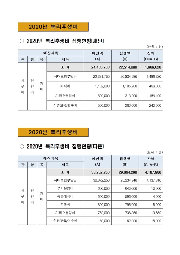 지방자치단체 출자·출연 기관의 운영에 관한 법률 제32조(경영공시)에 근거하여 2020년 복리후생비 집행현황을 다음과 같이 공시합니다