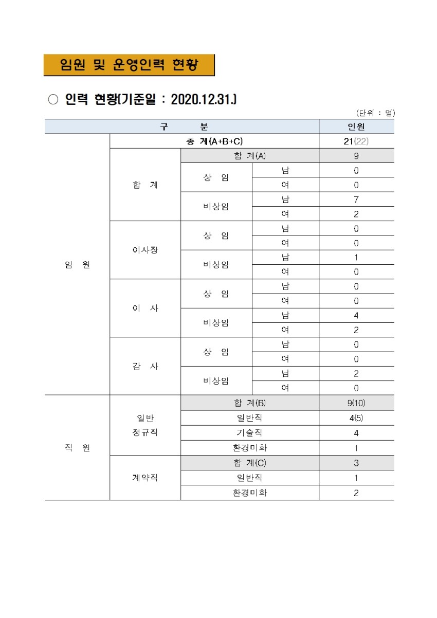 지방자치단체 출자·출연 기관의 운영에 관한 법률 제32조(경영공시)에 근거하여 임원 및 운영인력현황을 다음과 같이 공시합니다.