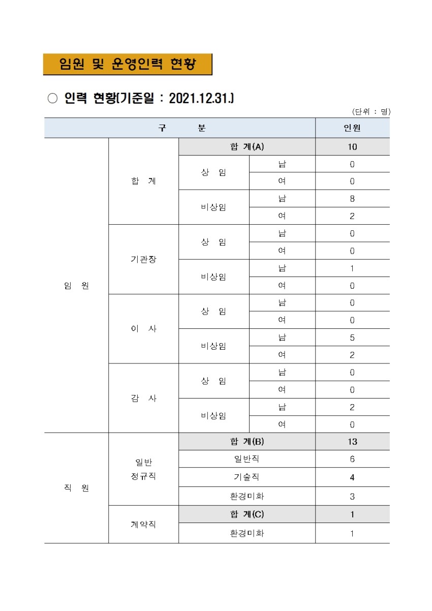 지방자치단체 출자·출연 기관의 운영에 관한 법률 제32조(경영공시)에 근거하여 임원 및 운영인력현황을 다음과 같이 공시합니다.