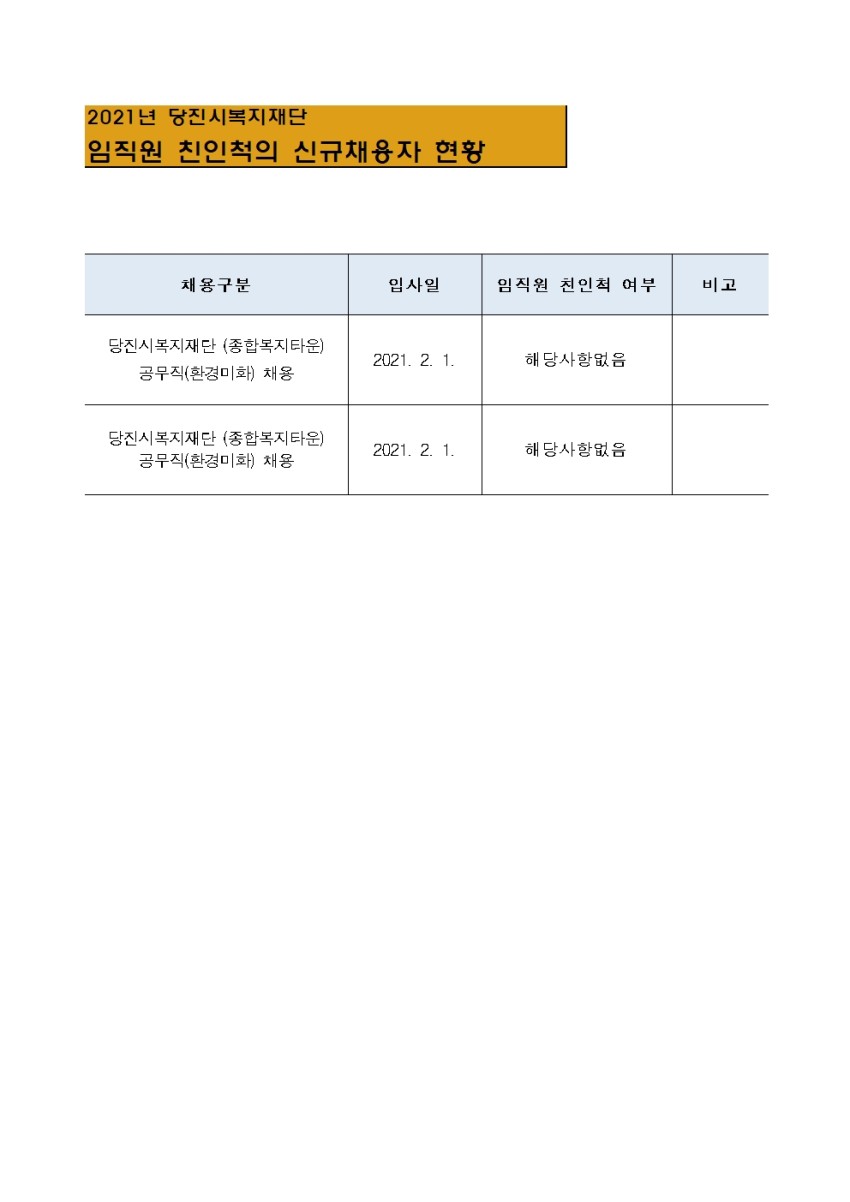 2021년 당진시복지재단 신규채용 직원 중 임직원 친인척 현황 공개