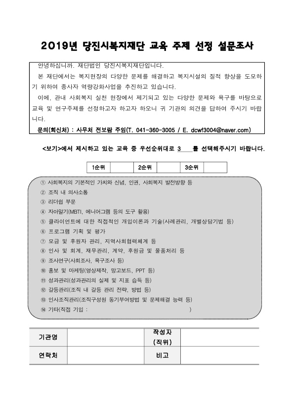 2019년 당진시복지재단 교육 및 연구 주제 선정을 위하여
