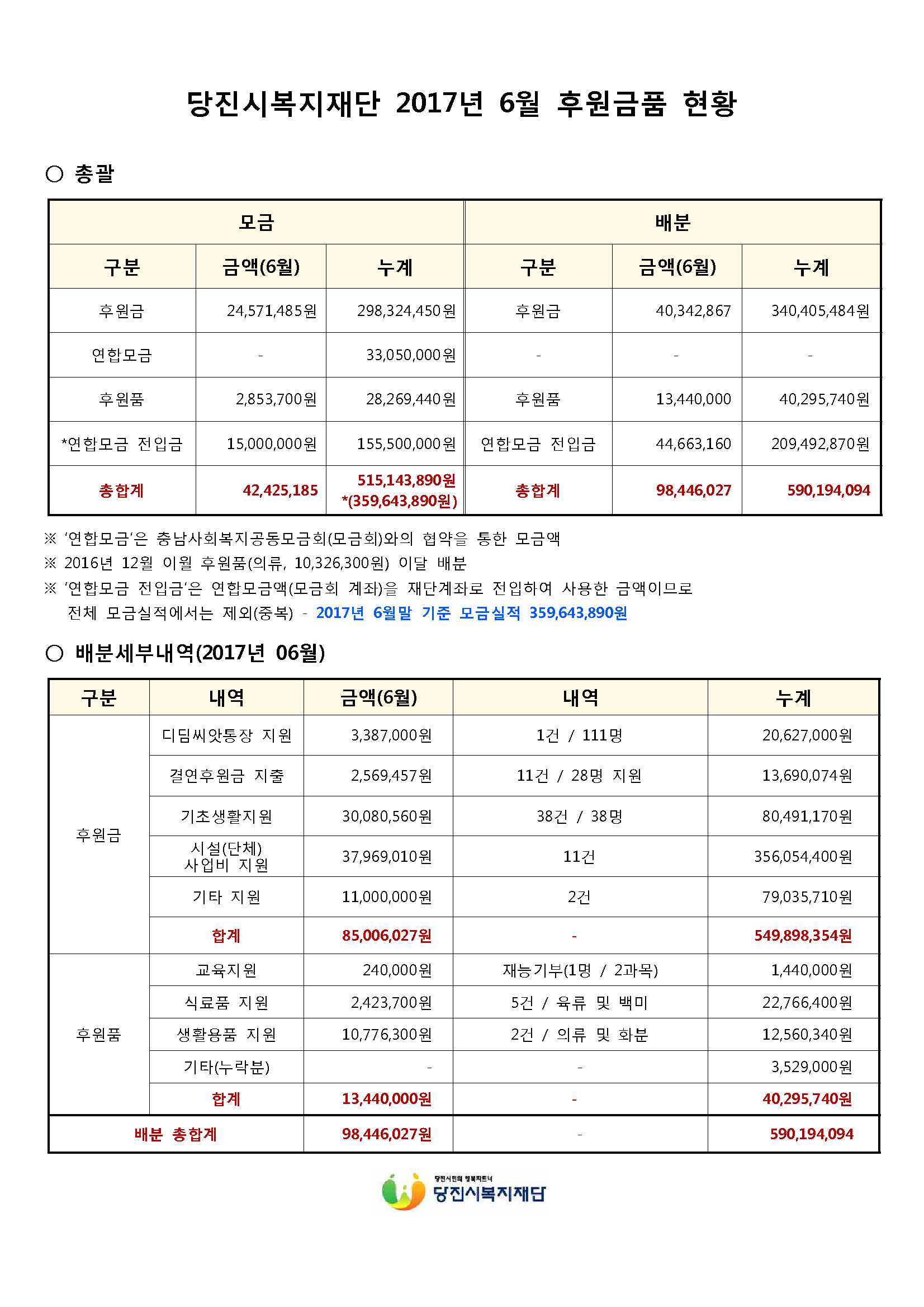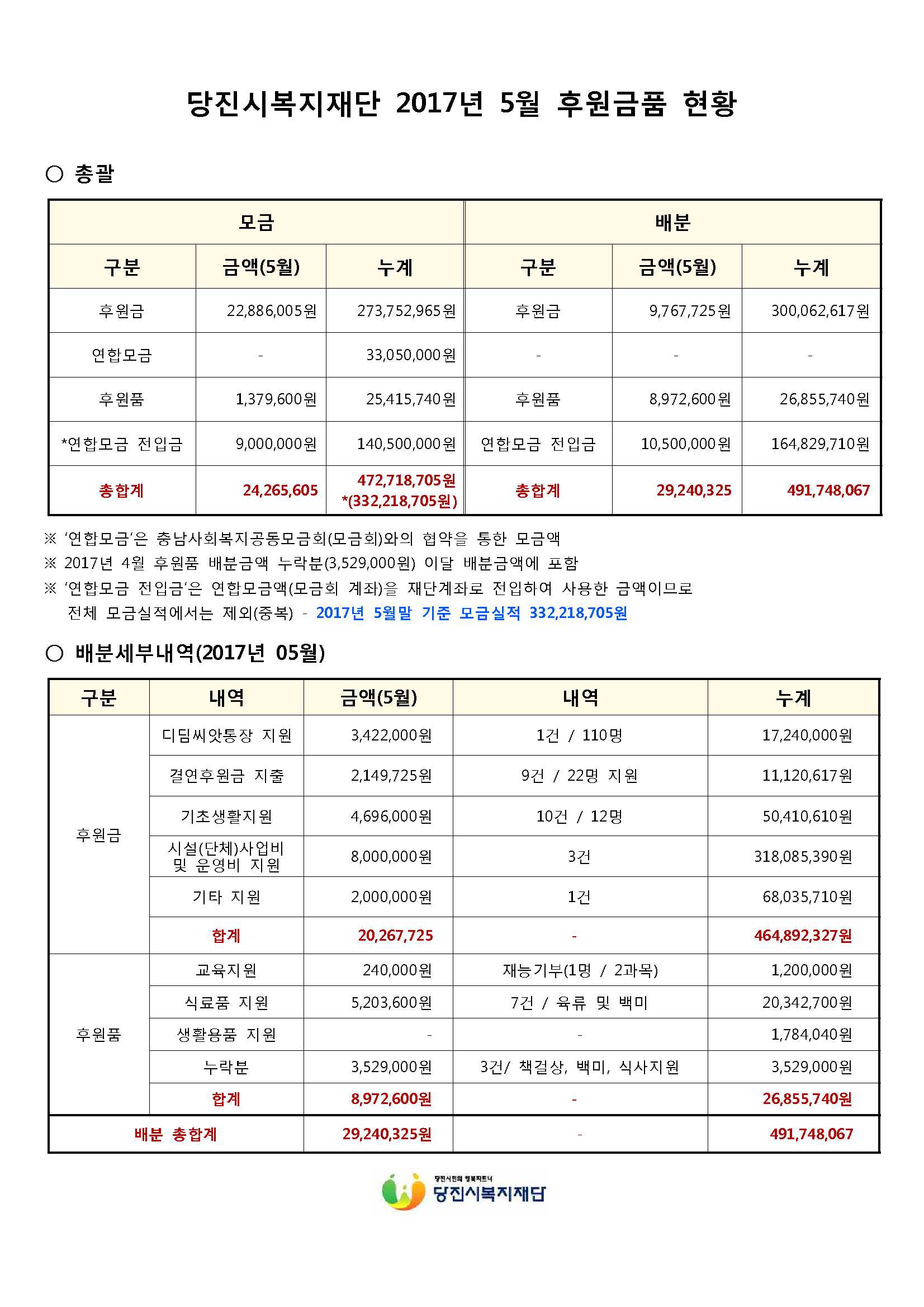 당진시복지재단 2017년 5, 6월 후원금품 모금 및 배분현황을 다음과 같이 공고합니다.