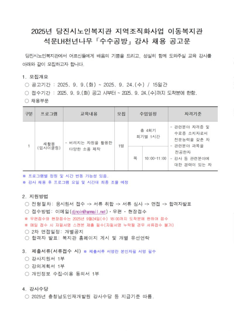 [수탁시설] 당진시노인복지관 지역조직화사업 이동복지관 석문LH천년나무「수수공방」강사 채용 공고