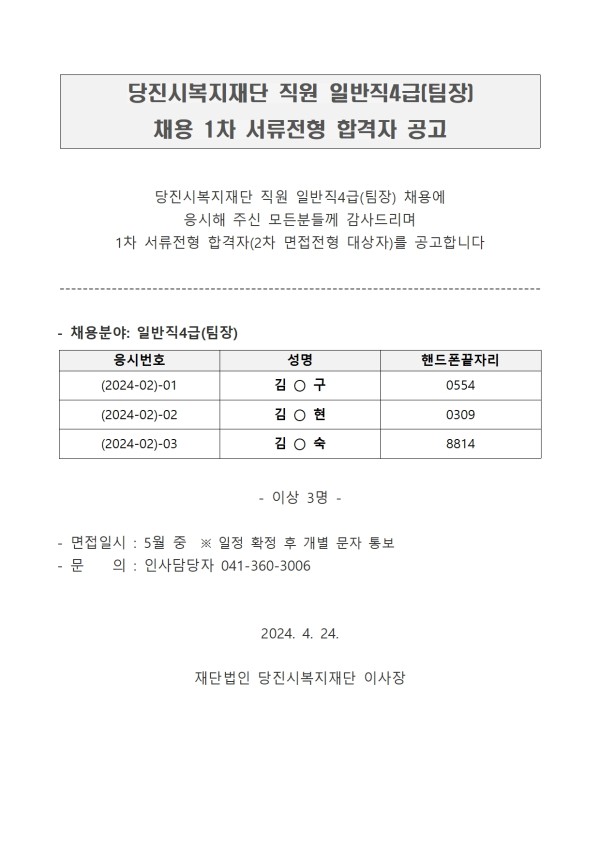 [채용 제2024-2호] 당진시복지재단 직원 일반직4급(팀장) 채용 1차 서류전형 합격자 공고