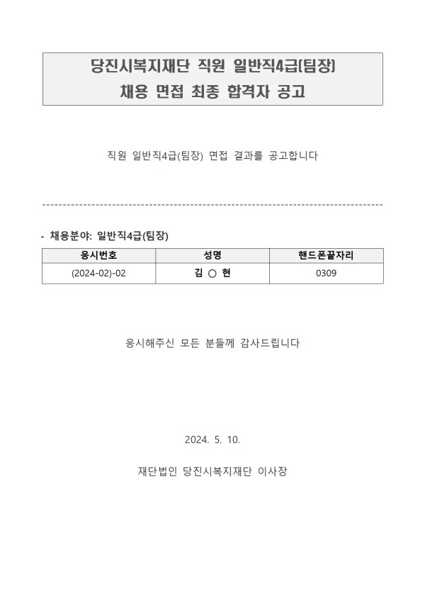 [채용 제2024-02호] 당진시복지재단 직원 일반직4급(팀장) 채용 면접 최종 합격자 공고