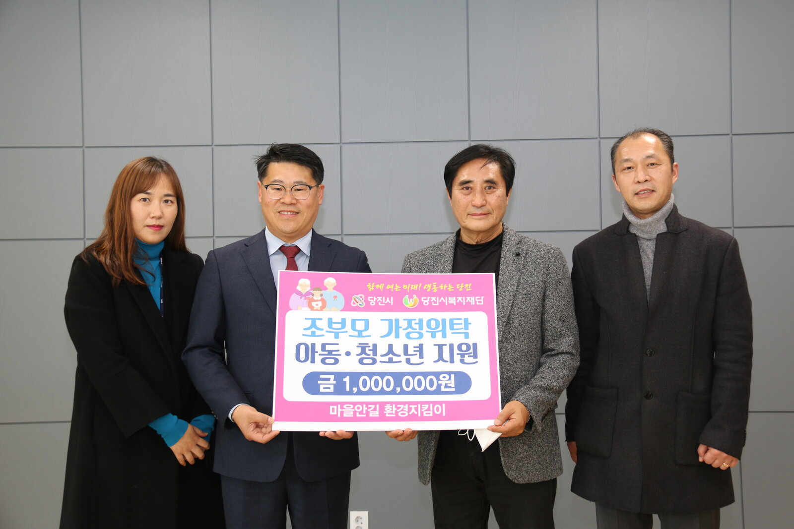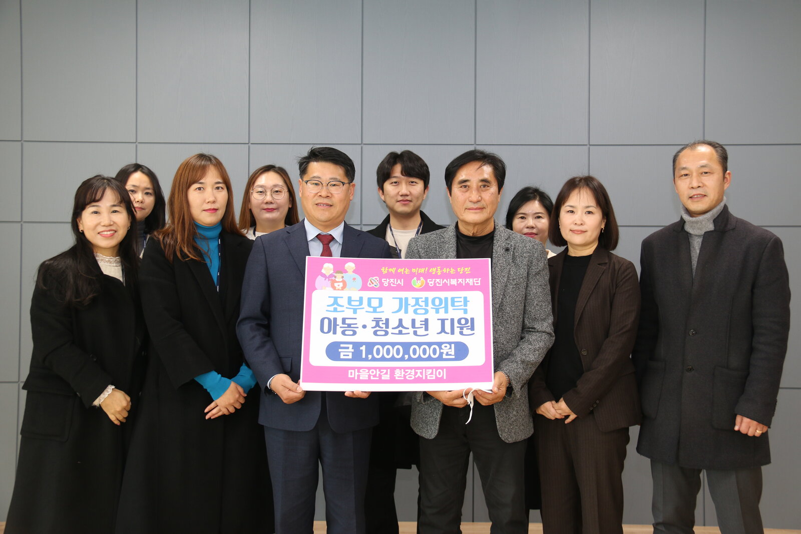 당진시니어클럽 노인 일자리 사업에 참여하는 마을안길 환경지킴이(반장 최병국)가 지난 12월 7일(수) 합덕읍 행정복지센터에서 시 출연 기관인 당진시복지재단에 우리 지역에 거주하는 조부모 위탁가정의 아동·청소년들에게 전달해 달라며 성금 100만 원을 전달했다.