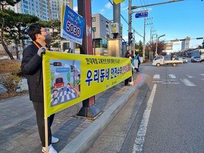 교통안전 홍보물(바닥페인팅)을 설치하며 횡단보도를 이용하는 시민을 대상으로 교통안전에 대한 경각심을 한껏 높이고 있다.