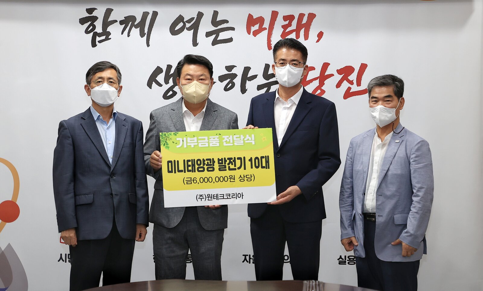 ㈜원테크코리아가 ‘취약계층 재생에너지 나눔 사업’의 일환으로 충남 당진시를 방문해 600만원 상당의 미니태양광 발전기를 기탁했다.