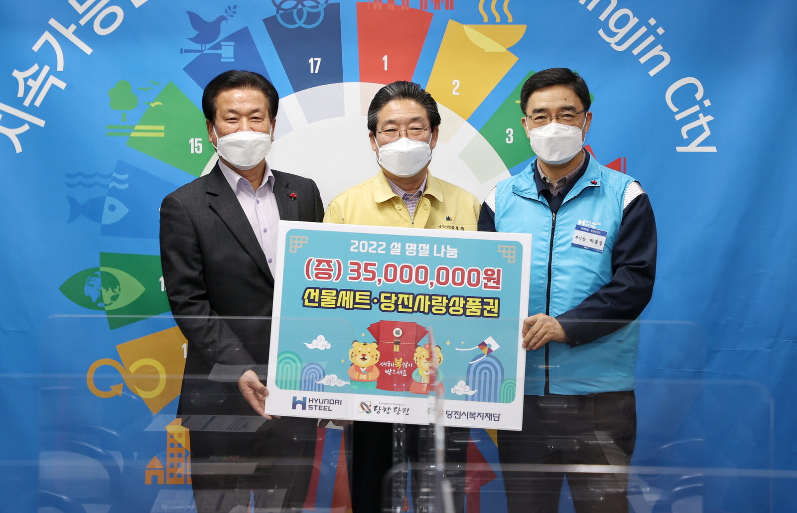 현대제철 임직원 봉사단은 이날 당진시청 목민홀에서 선물 세트 400개와 상품권 1500만 원,