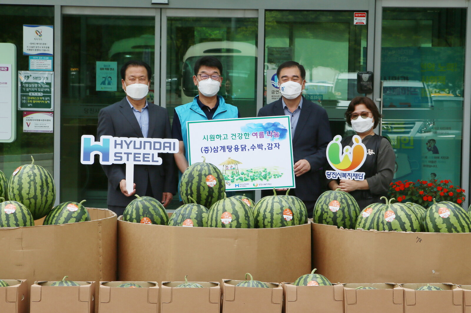 지난 14일, 현대제철 당진제철소(부사장 박종성, 이하 당진제철소)가 당진시복지재단(이사장 왕현정, 이하 재단)과 함께 '건강하고 시원한 여름나기'를 주제로 자매복지시설 33곳에 삼계닭 566마리, 감자1000kg, 수박122통을 전달했습니다.