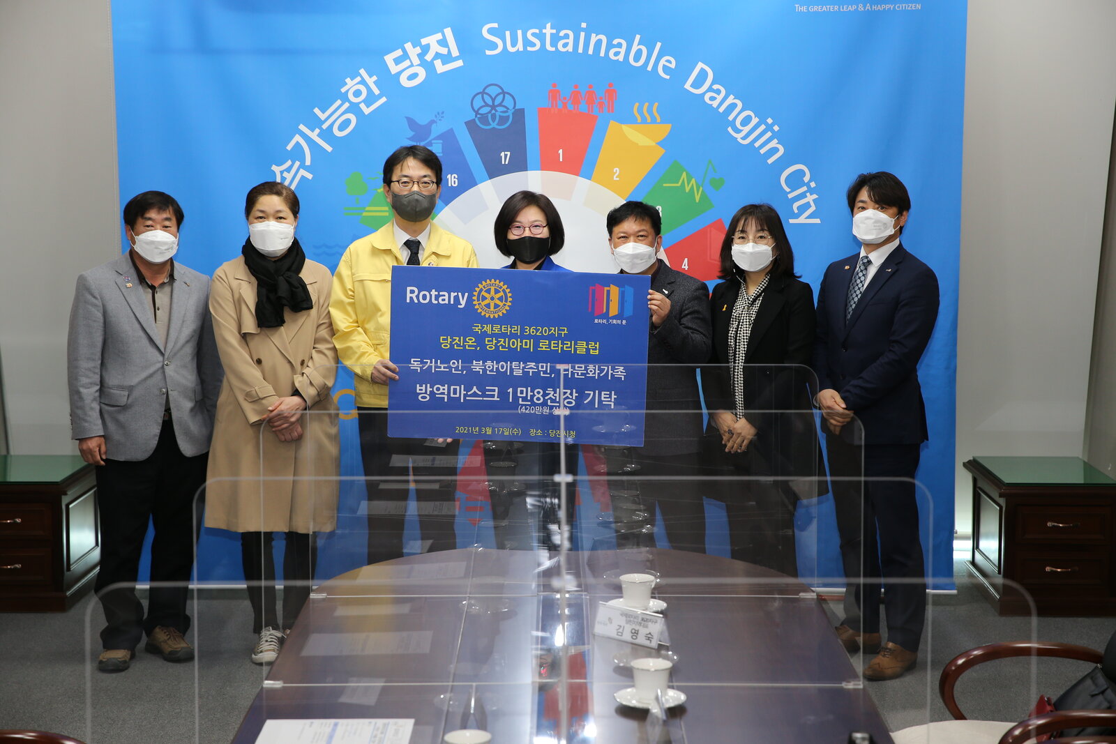 지난 17일, 국제로타리 3620지구 당진온(회장 김진영), 당진아미(회장 유병수)로타리클럽이 당진시청을 방문해 당진시복지재단(이사장 왕현정, 이하 재단)에 4백만원 상당의 마스크 18,000장을 전달하며 나눔문화 확산에 동참하였습니다.