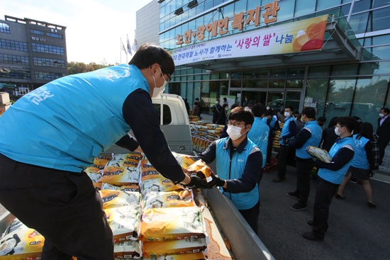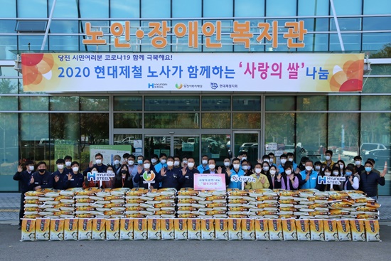 현대제철 당진제철소 노사가 급여 끝전 2200만 원을 모아 마련한 백미 10kg 630포를 28일 당진시종합복지타운 일원에서 우리 재단에 기탁했다.