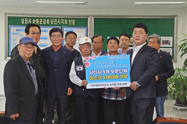 당진시 9개 보훈단체 국가유공자에게 전달해 달라며 150만원 상당의 마스크 3천매를 시 출연기관인 당진시복지재단에 기탁했다.