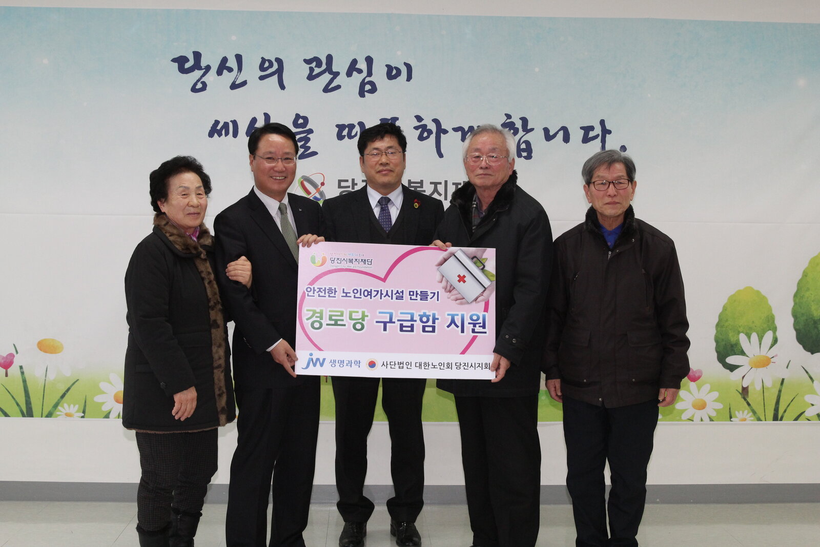 추운 날씨 속에 안전사고 발생이 빈번해지는 겨울첨 구급함 지원이 무엇보다 시급하다는 노인복지 현장의 의견을 적극 수렴한 당진시복지재단(이사장 김홍장)이 관내 송악읍에 소재한 JW생명과학(대표이사 최성남)에 경로당 구급함 설치 사업을 제안한 결과, 지난 1월 7일 '안전지킴 구급함 330'여개를 전달 받았습니다.