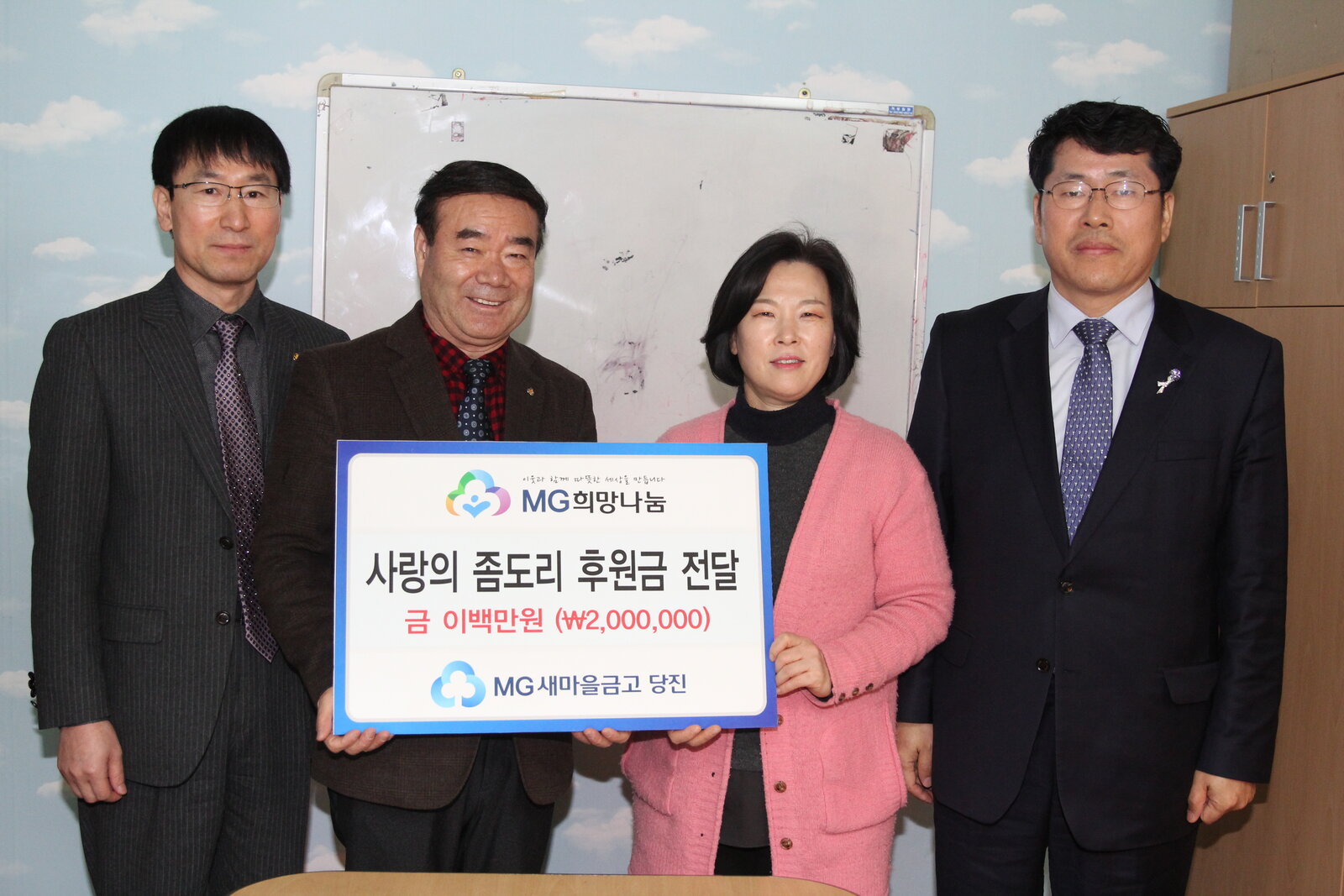 MG당진새마을금고(이사장 정영옥)가 지난 2월 16일 지역사회공헌사업의 일환으로 "MG희망나눔 사랑의 좀도리 운동"을 통해 마련된 후원금을 본 재단에 기탁해주셨습니다.