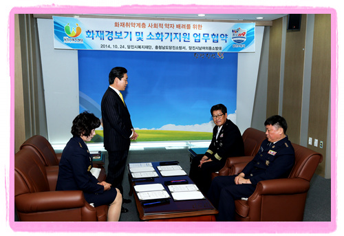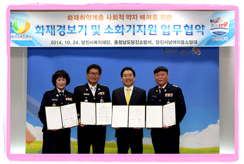 당진시복지재단(이사장 김홍장)과 당진소방서(서장 김득곤), 당진시 남·녀의용소방대(대장 김종기·황정옥)가 지난 24일 당진시청에서 '화재취약계층 화재경보기 및 소화기 지원 업무협약'을 체결했다.