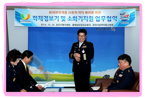 특히 당진 소방서는 매년 11월 9일 소방의 날을 맞아 진행해 오던 기념식과 체육대회를 대신해 이번 협약을 계기로 복지재단과 함께 각 가정을 방문해 화재경보기와 소화기 설치와 함께 소방안전 점검과 소화기 사용법 교육을 진행하기로 해 눈길을 끌었다.