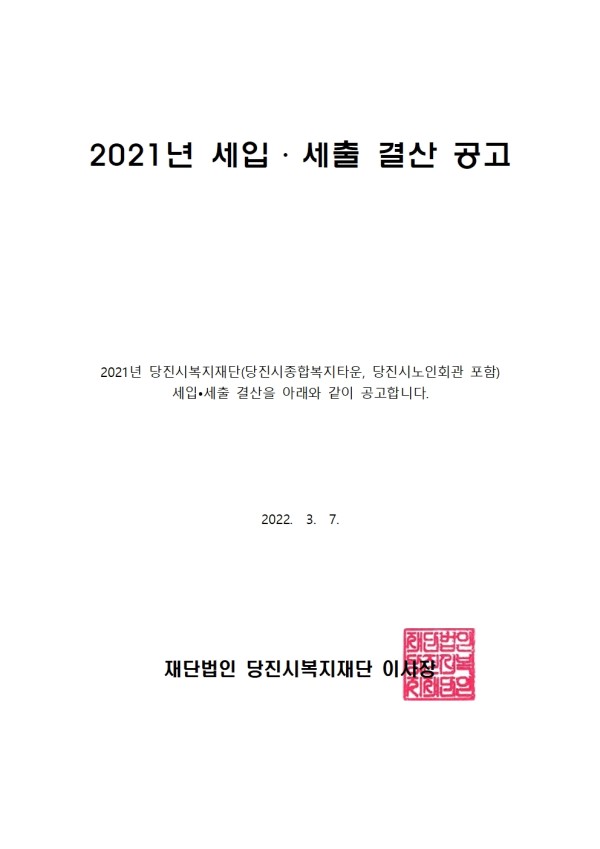 2021년 당진시복지재단 결산 및 후원금품 수입사용 공고