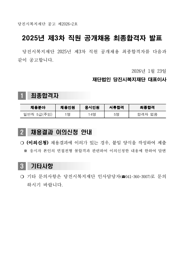 - 다음글 [복지재단] 2025년 제3차 직원 공개채용 서류합격자 발표 26.01.16