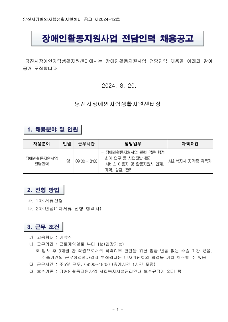 [수탁시설] 당진시장애인자립생활지원센터 장애인활동지원사업 전담인력 채용 공고